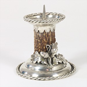 Kerzenleuchter, Deutsch Mitte 20.Jhd., Silber 800/000, sig.: AB (Alfred Butschta Breslau), Schaft aus Hirschhorn, mit Eicheln u. Eichenlaub verziert, Ränder mit kordierten Drähten gestaltet, Fuß: D = ca. 9,1 cm, H = 9,9 cm, total 193,7 g, solide gearbeitet !