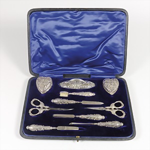 Maniküre Set, Birmingham 1898-99 (2 Dosen), restliche Accessoires 1905-08, Sterling Silber 925/000, sig.: L & S (vorwiegend) u. W & H, 2 kl. Dosen in "HERZ" Form, innen Feuervergoldet, die Oberflächen sind mit reliefartig ausgearbeiteten Putten-Engelsköpfen gestaltet; an den Griffen werden die Putten-Engelsköpfe von floralen Elementen umrankt, sehr gut erhaltene Original-Schatulle, innen mit Samt ausgelegt, guter Erhaltungszustand !! Schatulle (mit Leder überzogen) ca. 27,0 x 18 cm