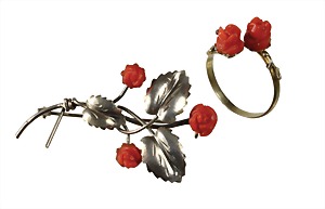 Lot: "ROSEN", Silber 800/000, 1 Ring, 2 geschnittene Korallen, RW ca. 58,5; 1 Brosche "BLÄTTER", 3 geschnittene Korallen, L = 50,0 mm