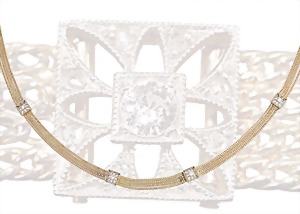 Collier, "ART-DECO" der 1920/30er Jahre, Gelbgold 585/000 (geprüft), 5 Diamanten ca. 0,22 ct weiß, 40 Diamantrosen weiß, die Diamanten sind grazil in Platin eingefasst. Die 4-reihige Kette ist beweglich an den quadratischen Elementen eingearbeitet, untergebautes Kastenschloss, Länge ca. 37 cm. Die Kette wird sehr eng am Hals getragen !