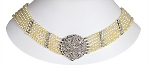Collier, "ART-DECO" der 1920er Jahre, 6-reihiges Perlcollier mit dekorativer Schließe (in Platin gearbeitet), D = 31,5 mm, der zentrale Altschliff-Diamant ca. 0,50 ct weiß und die 72 Altschliff-Diamanten/Rosen sitzen in einer grazil durchbrochenen Blüten-Rosette, 6 Perlenstränge, L = ca. 38,5 - 43,3 cm, die vier Perlstege, besetzt mit je 8 Diamanten, sind in Gold 585/000 gearbeitet, integriertes Kastenschloss mit 2 Sicherheitsachten
