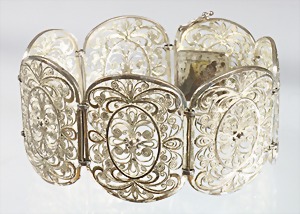 Filigranes Armband, Silber 835/000 sig.: WN, untergebautes Kastenschloss mit Sicherheitsacht, B = ca. 35 mm, L = 19,8 cm, die einzelnen Elemente werden durch sehr feine Drähte floral gestaltet