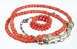 Lot: 1 Korallenkette, Silber 800/000, Korallen D = 4,0 - 5,5 mm, L = 55,0 - 64,0 cm (incl. Verlängerungskettchen; 1 Korallenring, 48 Korallenkugeln D = 3,9 mm auf Draht gefädelt , total 22,7 g