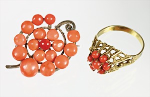 Lot: 1 Ring, GG 585/000, 7 Korallenkugeln, RW ca. 56,5; 1 Brosche, Metall verg., 17 Korallenboutons D = 4,2 - 7,1 mm