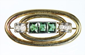 Brosche 1930/40er Jahre, GG/WG 585/000, zentral drei Turmaline ca. 2,70 ct, transparentes, leuchtendes grün (1 Stein mit Abplatzer), 6 Diamanten ca. 0,12 ct weiß, alle Steine weiß gefasst, Haken mit Sicherung, ca. 45,8 x 22,6 mm, schwer gearbeitete, total 12,5 g