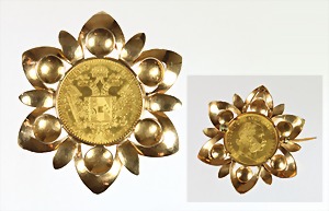 Brosche, GG 585/000, Ungarische Goldmünze 1915, D = ca. 42 mm, total 8,7 g
