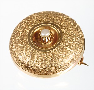 Runde Brosche, 1930/40er Jahre, GG 585/000, zentrale Perle, aufwändig gravierte u. tremblierte Oberfläche, D = 30,3 mm