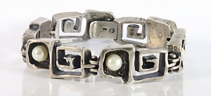 Armband 1950/60er Jahre, Silber 835/000, 6 Akoja-Perlen D = 6,5-7,0 mm, B = ca. 16,6, L = 20,2 cm, schwer gearbeitet !