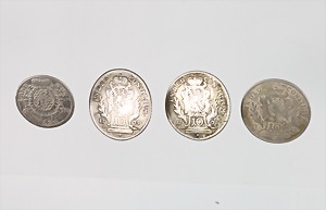 Lot: 3 Silberknöpfe aus antiken Münzen, 3 Stck. 10 Kreuzer, 2 x 1775, 1 x 1776, Bayern Maximilian lll. Gekr. Wappenschild auf Postament; 1 Stck., 6 Kreuzer 1766 LAND MUNZ, MAX IOS H.I.B.C.&