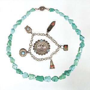 Lot: Silber 900/000, Brosche "MOSCHE" mit türkisfarbenen Steinen, D = 34,4; 1 Bettelarmband mit roten u. türkisfarbenen Steinen, L = ca.19,0 cm (beides wohl Nordafrika 1.Hälfte 20.Jhd.); 1 Türkiskette, Schließe: SILVER, L = ca. 46,5 cm, total 42,9 g