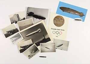 Brosche, "1936 Olympia Zeppelin Hindenburg", Silber 800/000, Aufschrift Hindenburg Olympiaringe (Symbol) D-L.Z.129, Originalzustand, L = 40,3 mm, 10 Originalfotos des Zeppelins im Hangar, beim Start, über dem Olympiastadion u. in der Luft; 1 Postkarte: Brandenburger Tor Olympische Spiele Berlin 1936