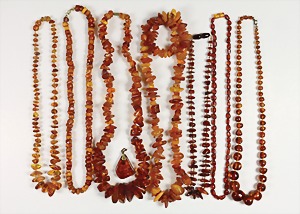 Lot: 6 Bernsteinketten u. 1 Anhänger H = 52 mm, Schließen Metall bzw. Drehschließe, total 351,1 g