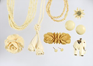 Lot: Elfenbein/Bein 1.Hälfte 20.Jhd., 2 Ketten, 3 Broschen, 1 Anhänger "ELEFANT" H = 44,5 mm, 1 Paar Clips u. 1 Paar Stecker, total 114 g. (Ein Versand in Nicht-EU-Länder ist für diesen Artikel leider nicht möglich !)