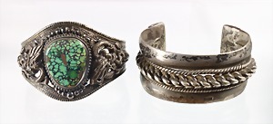 Lot: 2 Armreife (Spangen), Nepal/Tibet ?, Silber, 1 Reif mit Türkis u. seitlichen Drachenmotiven, B = 46 mm, innen ca. 60 x 53 mm; 1 Spange, B = 30,0 mm, innen ca. 59 x 50 mm, total 172 g (1 Reif seitl. angebrochen)